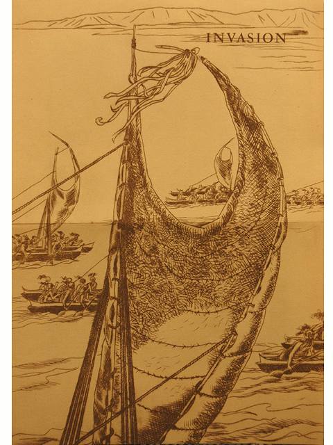 | Description: | From Ke Anuenue. Folded card style with print inside of battle at nuuanu Unframed |
