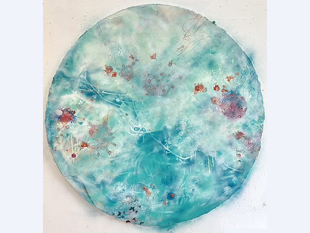 | Description: | spraypaint/wax pencil/collaged marbleized paper Unframed |